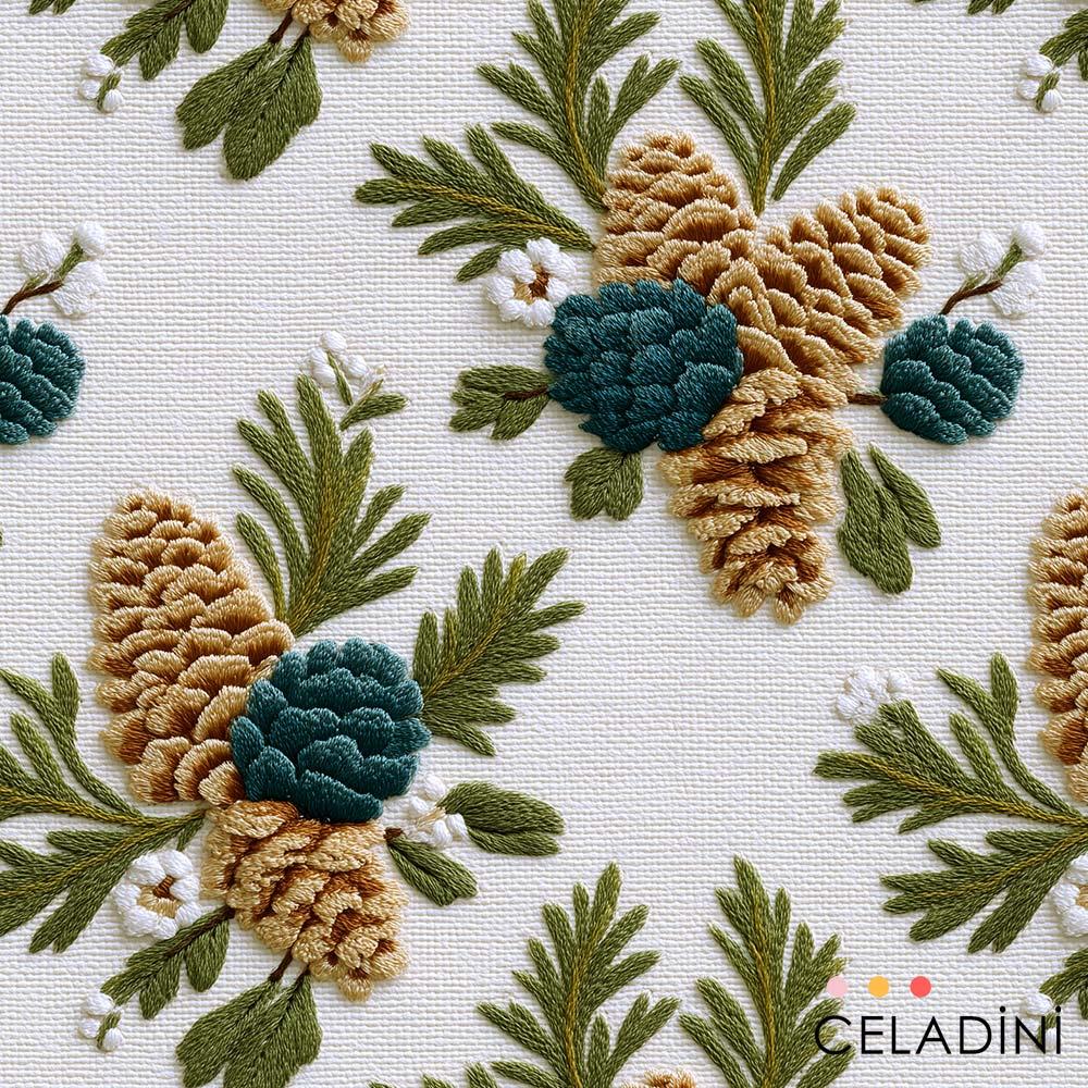 3D Nakış Efektli Altın Kozalaklar Ve Çam Yaprakları Yılbaşı Kumaşı