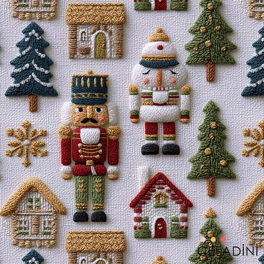 3D Nakış Efektli Fındıkkıran Askerler ve Ağaçlar Yılbaşı Kumaşı