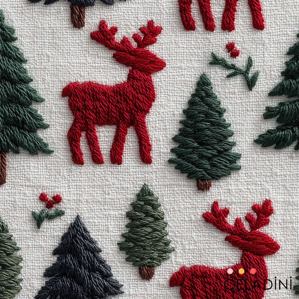 3D Nakış Efektli Geyikler ve Çam Ağaçları Yılbaşı Kumaşı