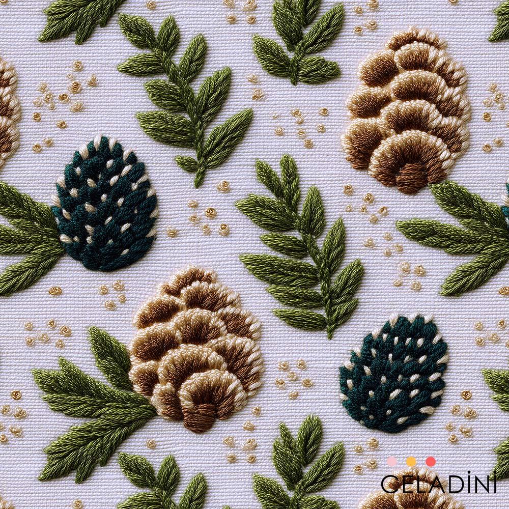 3D Nakış Efektli Kozalaklar Ve Çam Yaprakları Yılbaşı Kumaşı