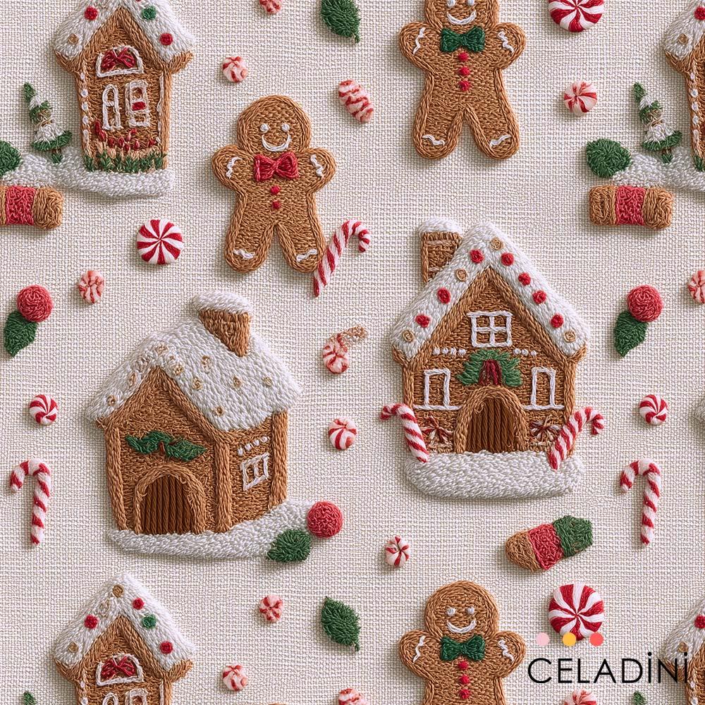 3D Nakış Efektli Kurabiye Adamlar ve Evler Yılbaşı Kumaşı