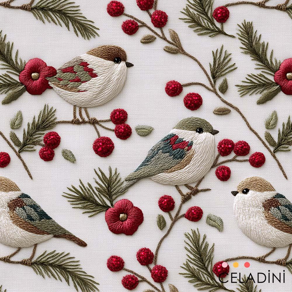 3D Nakış Efektli Kuşlar ve Kırmızı Meyveler Yılbaşı Kumaşı